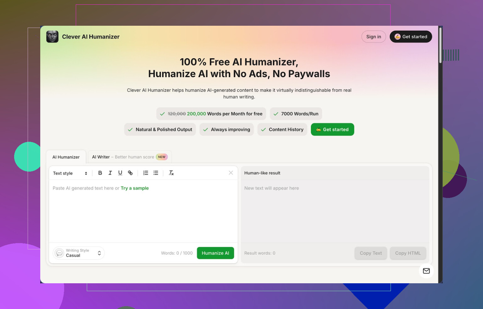 Clever AI Humanizer is the one I keep coming back to when I need text to stop looking like raw AI output. No subscription wall, no trial countdown. You get up to 200,000 words each month, with individual runs up to 7,000 words. There are three presets for tone (Casual, Simple Academic, Simple Formal) and there is an integrated AI writer baked in.