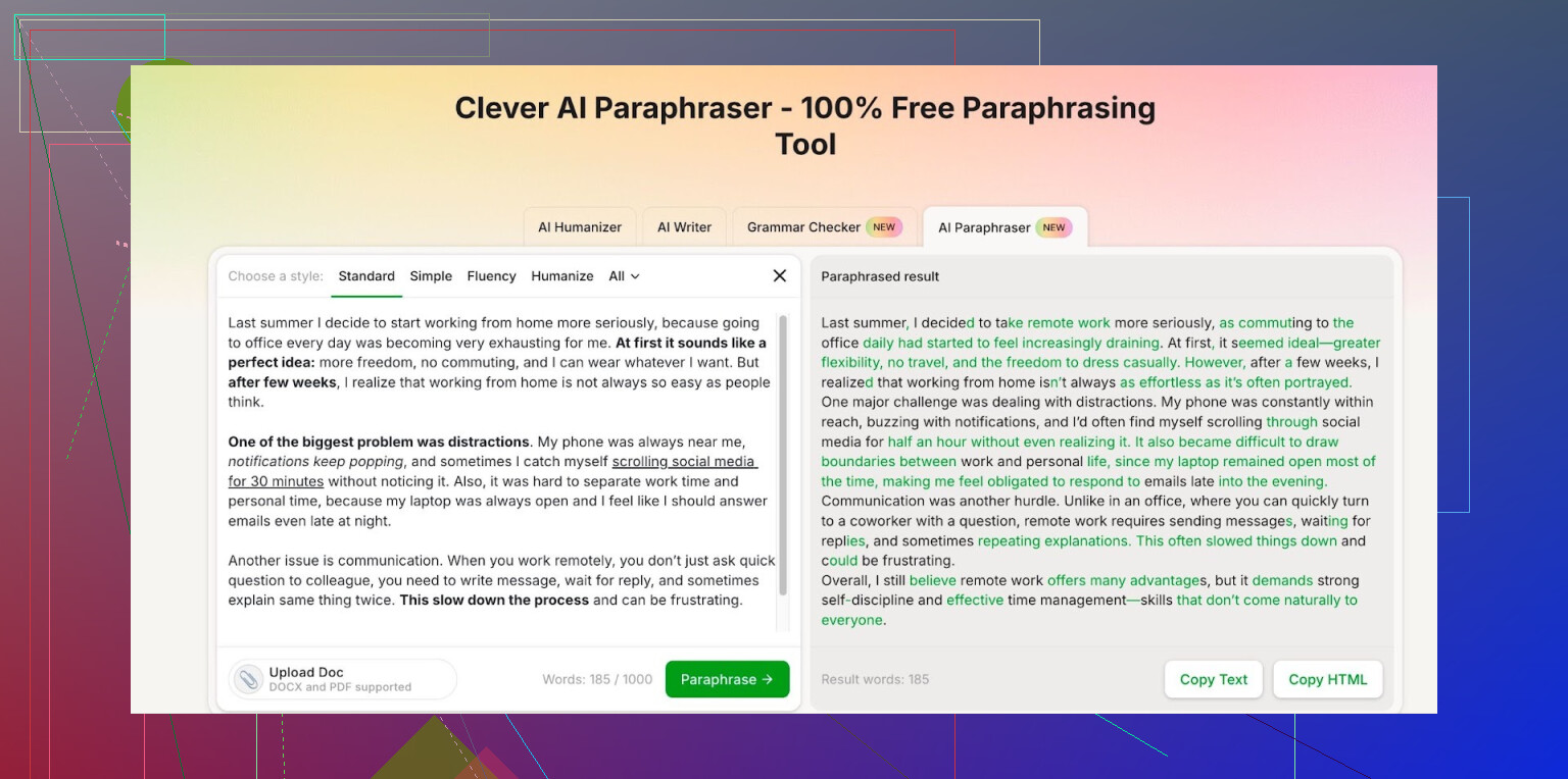 I started hunting around for something I could use daily without getting hit with “upgrade to premium” every few clicks. Ended up on Clever AI Humanizer and stuck with their Free AI Paraphraser here: