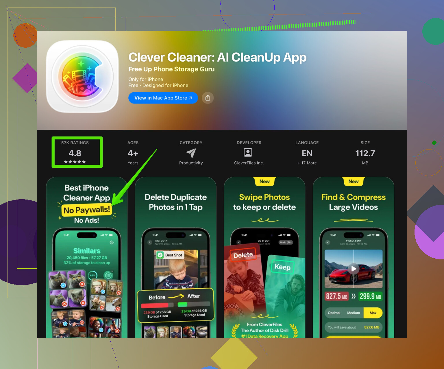 - Utiliser un nettoyeur intelligent comme Clever Cleaner App pour trouver les photos en double et les gros fichiers